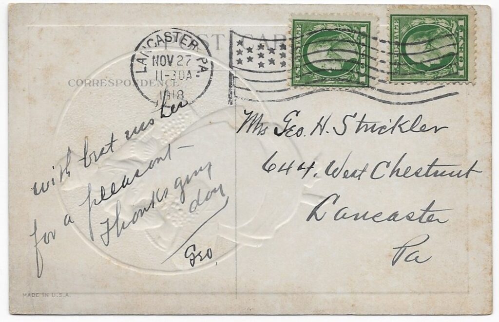 In November of 1918, Mrs. Strickler received a Thanksgiving postcard from “Geo.”