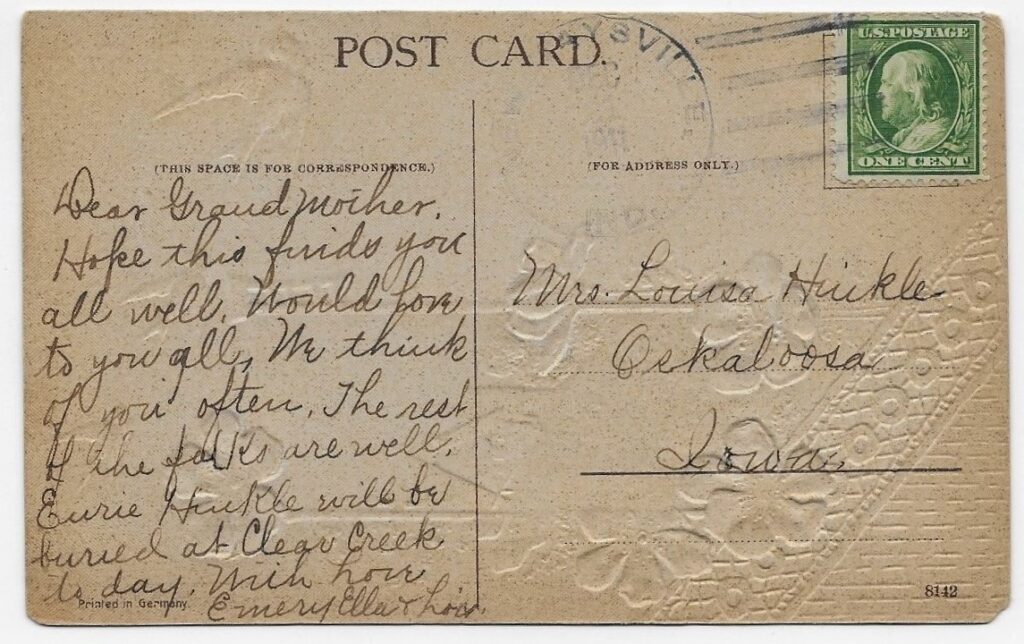 On the reverse, Mrs. Hinkle is addressed as “Dear Grandmother”.