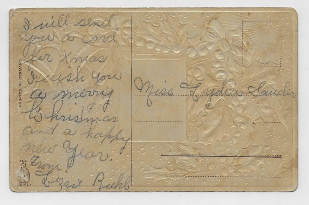 Sometime near Christmas in a year near 1910, Miss Lydia Sauder received a postcard from Lizzie Riehl.