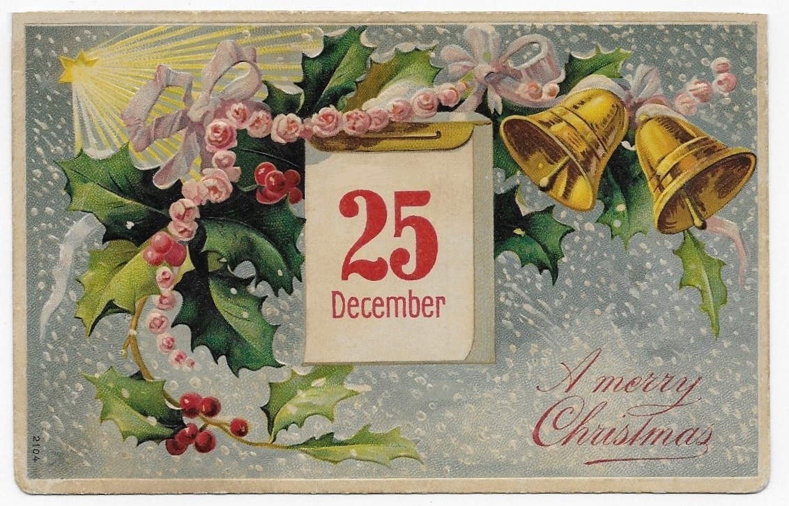 On a pale blue background that seems to be dotted with snow, sprigs of holly (which are bound by a garland of roses) support a pair of small gold bells.