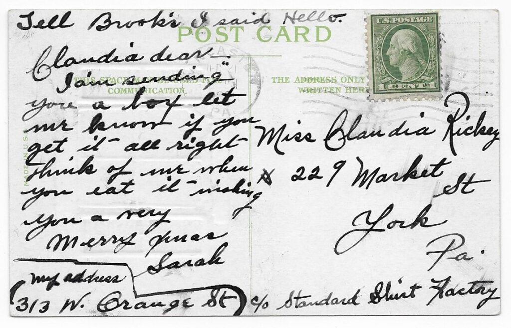 In December of a year near 1922, Claudia received a Christmas postcard from Sarah.