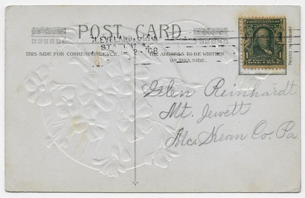 In the Spring of 1908, Glen received an Easter postcard from an unidentified correspondent.