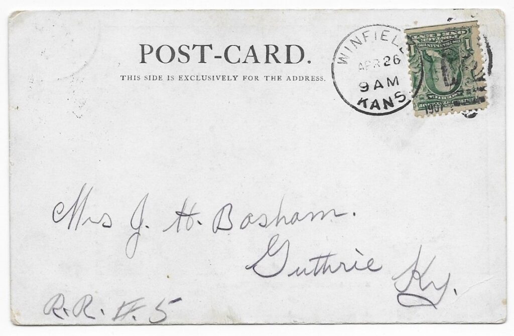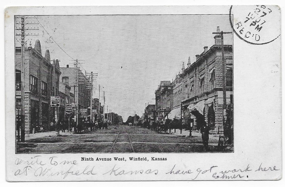 Elmer mailed the postcard from Winfield, a city and county seat of Cowley County, on the Walnut Creek in south-central Kansas.