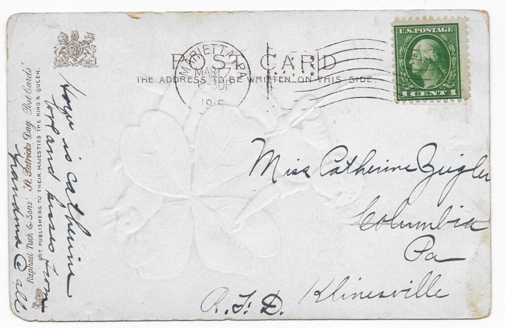 In March of 1915, Catherine received a St. Patrick’s Day postcard from her grandma.