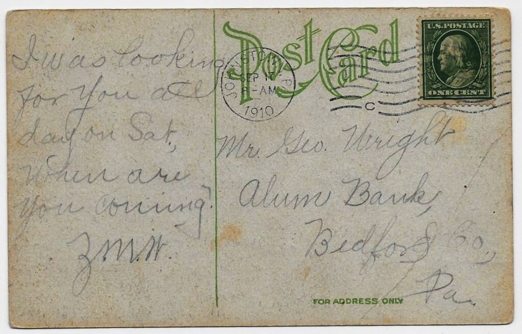 The postcard was mailed from Johnstown, the city at the head of the Conemaugh River in Cambria County – about 57 miles east of Pittsburgh,