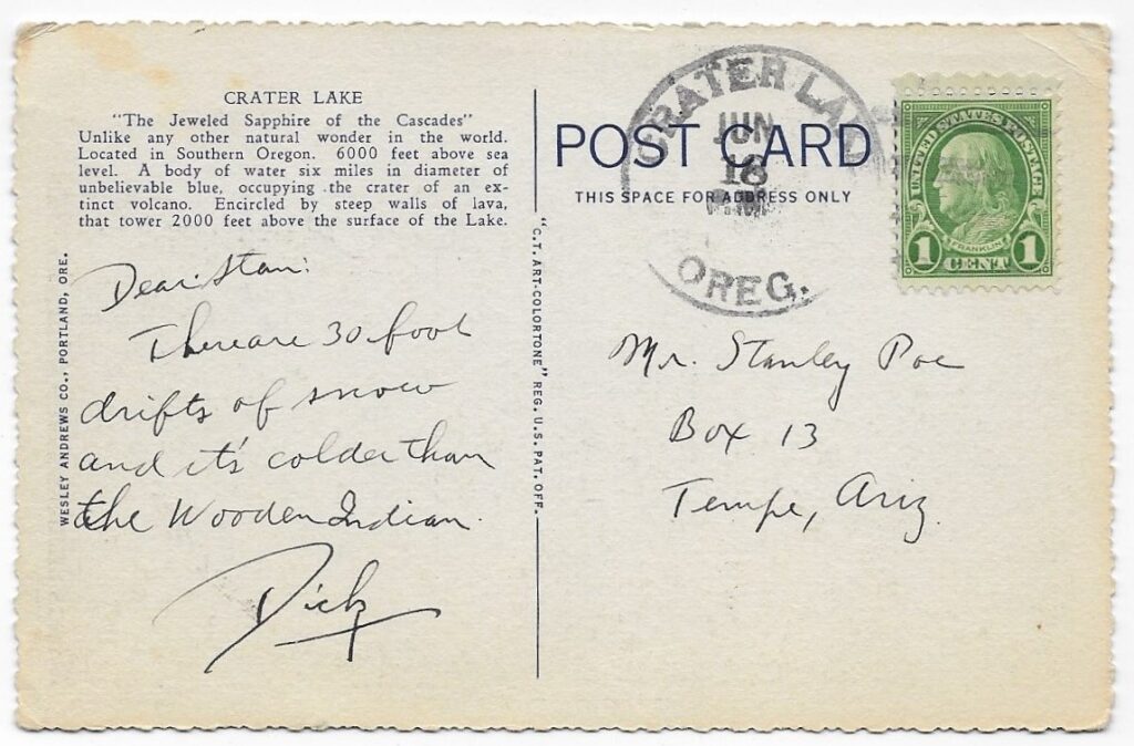 Dick mailed the postcard from “Crater Lake”: the post office is located in the Rim Village which is the headquarters of the National Park in southern Oregon.