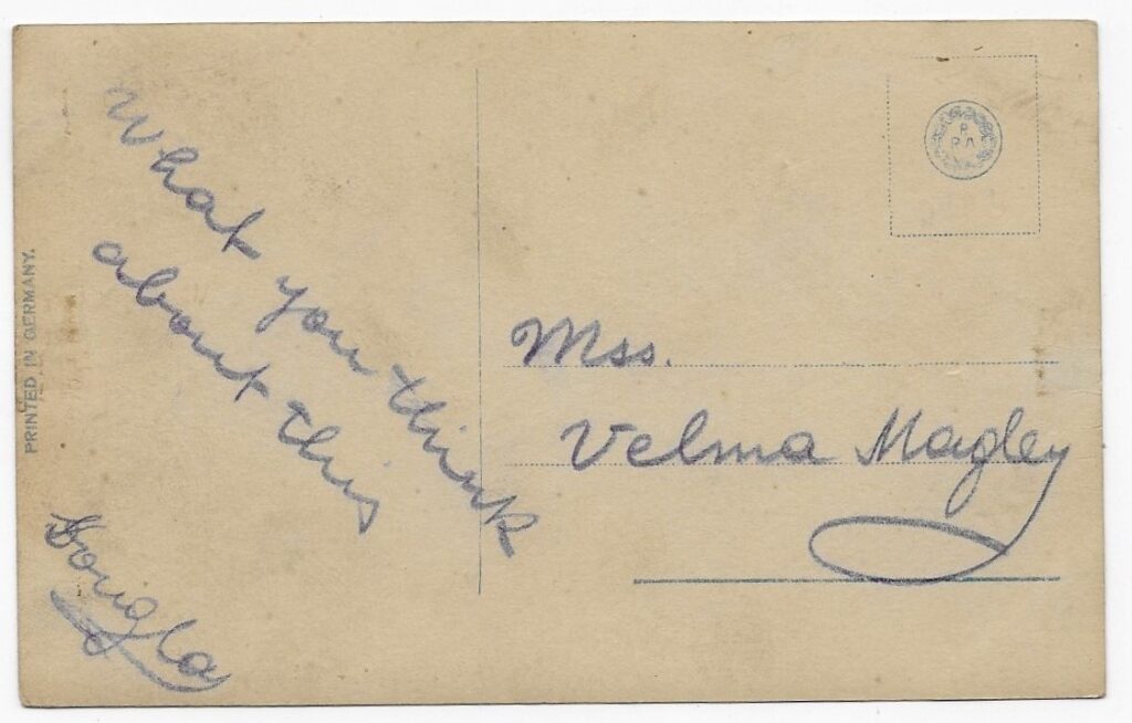 Sometime around 1914, Velma was given a postcard photograph by Douglas.