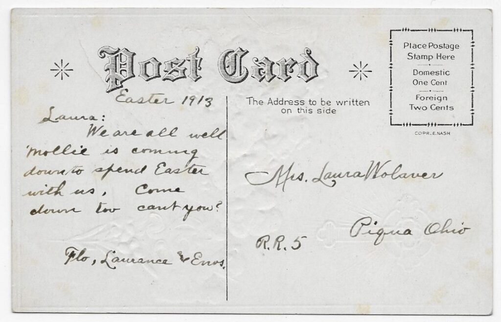 Sometime before Easter in 1913, Laura received a postcard from Flo and her family.