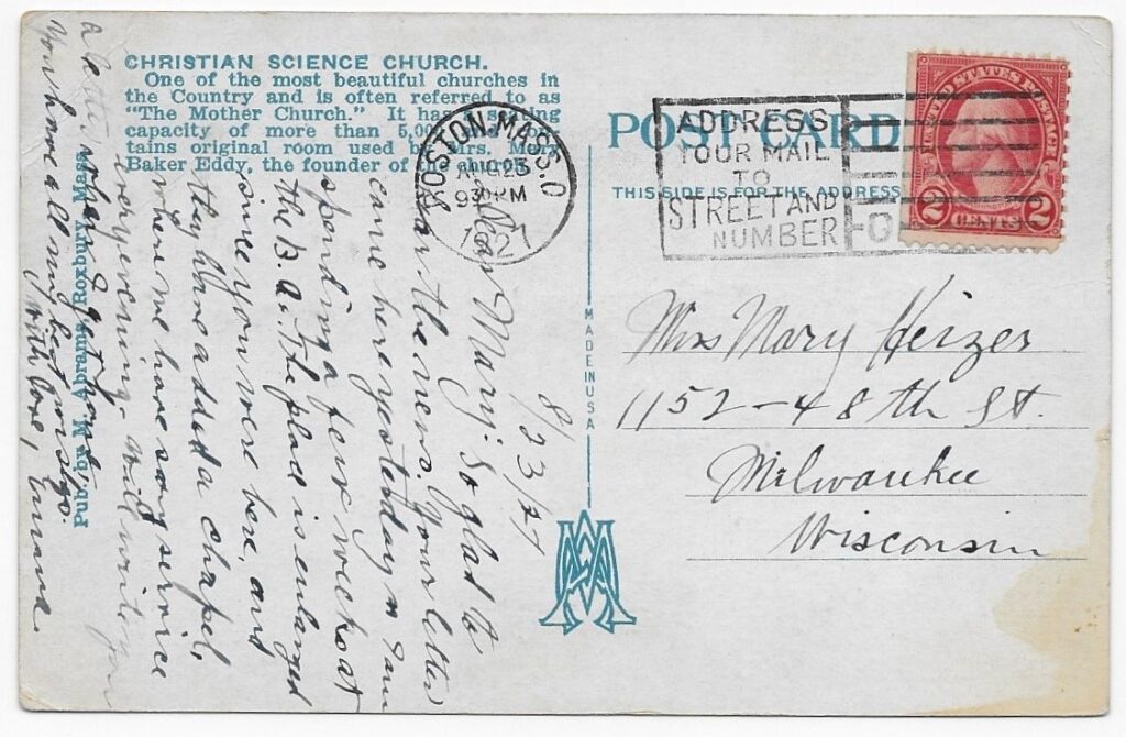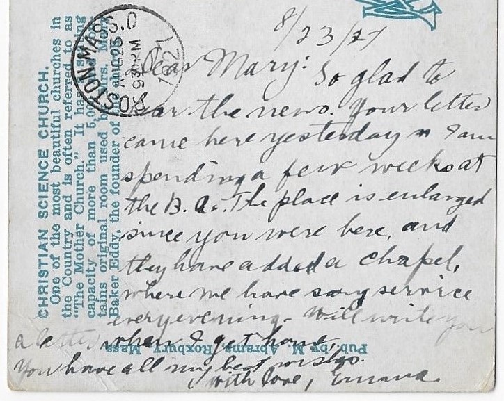 One hopes that Mary was pleased by the postcard, that Emma continued to enjoy her visit to Boston, that Mary was happy in the situation she shared in her letter (she may be engaged to be married), and that Emma composed her letter promptly.