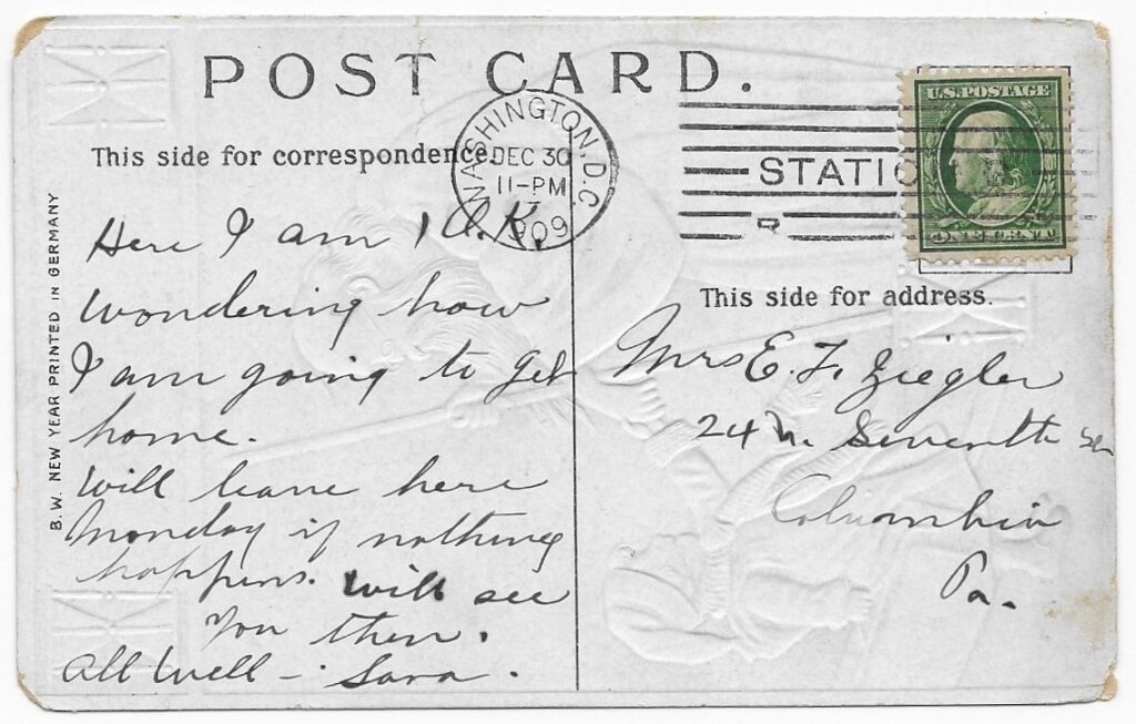 At the end of December in 1909, Mrs. Ziegler received a New Year postcard from Sara.
