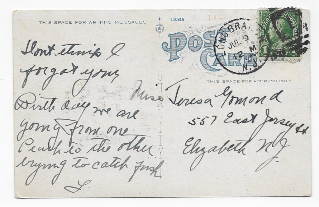 The postcard was mailed from Long Branch, a coastal city in Monmouth County which has been a popular resort of east central New Jersey since the 19th century.