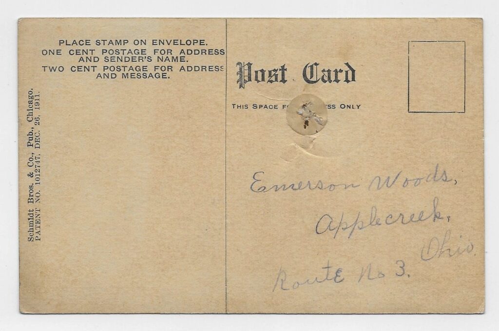 The postcard was published by Schmidt Brothers & Company of Chicago – using a process patented in 1911.