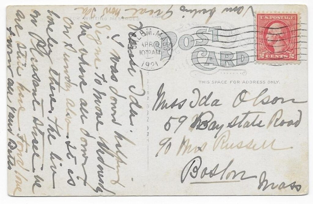 The postcard was mailed from Salem, the historic coastal city of Essex County on the north shore of the Greater Boston Bay.
