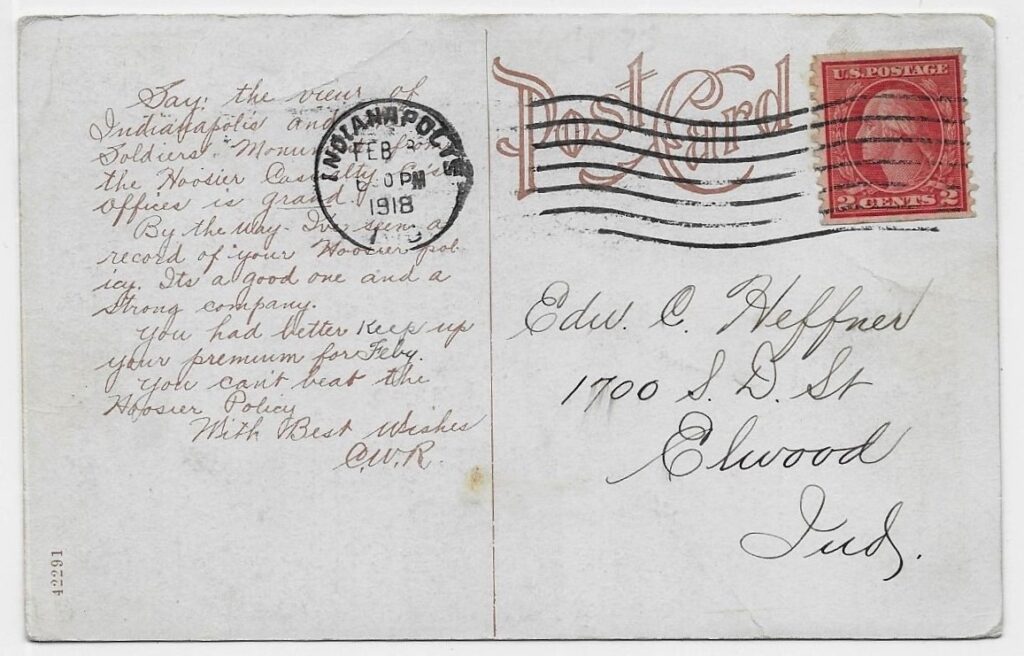 The postcard was mailed from Indianapolis, the capital city about 45 miles southwest of Elwood.