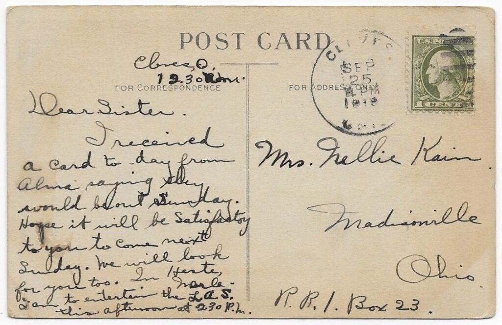 In September of a year near 1913, Nellie received a postcard from her sister.