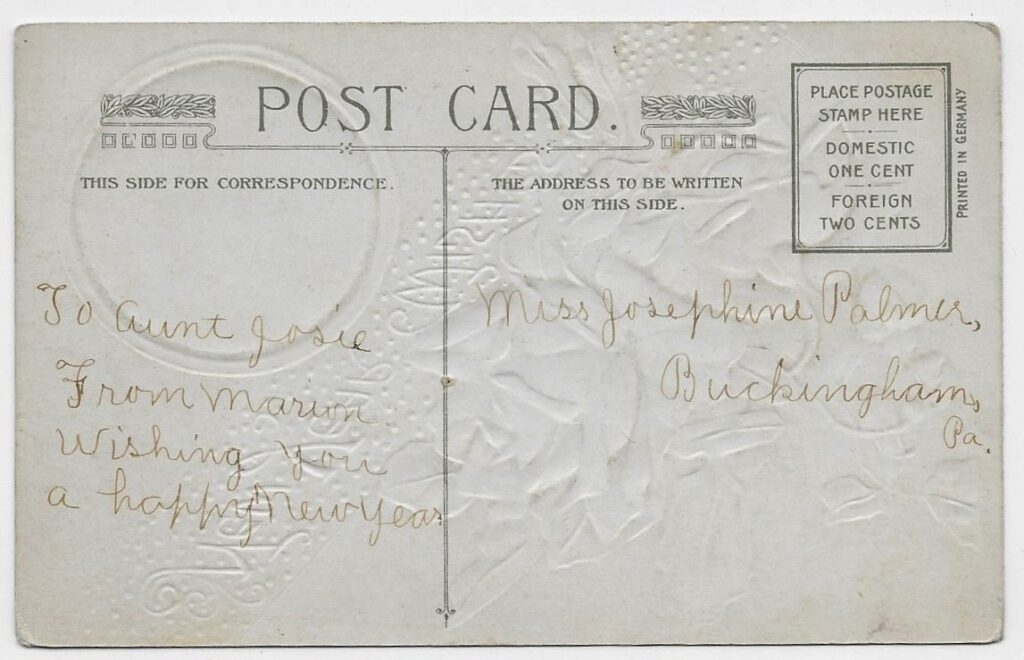 In a year near 1910, Miss Palmer received a New Year postcard from her niece, Marion.