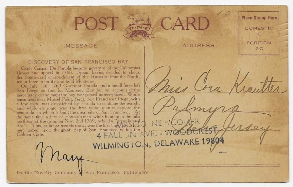 Sometime in a year near 1914, Cora received a history postcard – it does not appear to have been mailed.