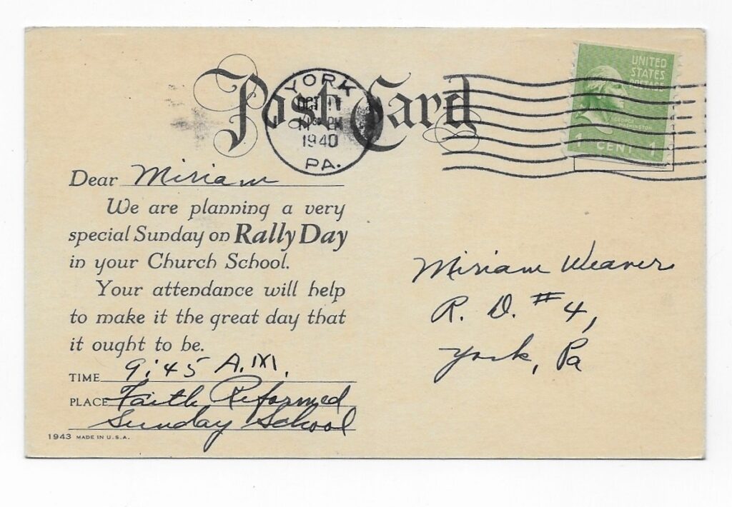 In October of 1940, Miriam received a colorful postcard from “Faith Reformed Sunday School”.