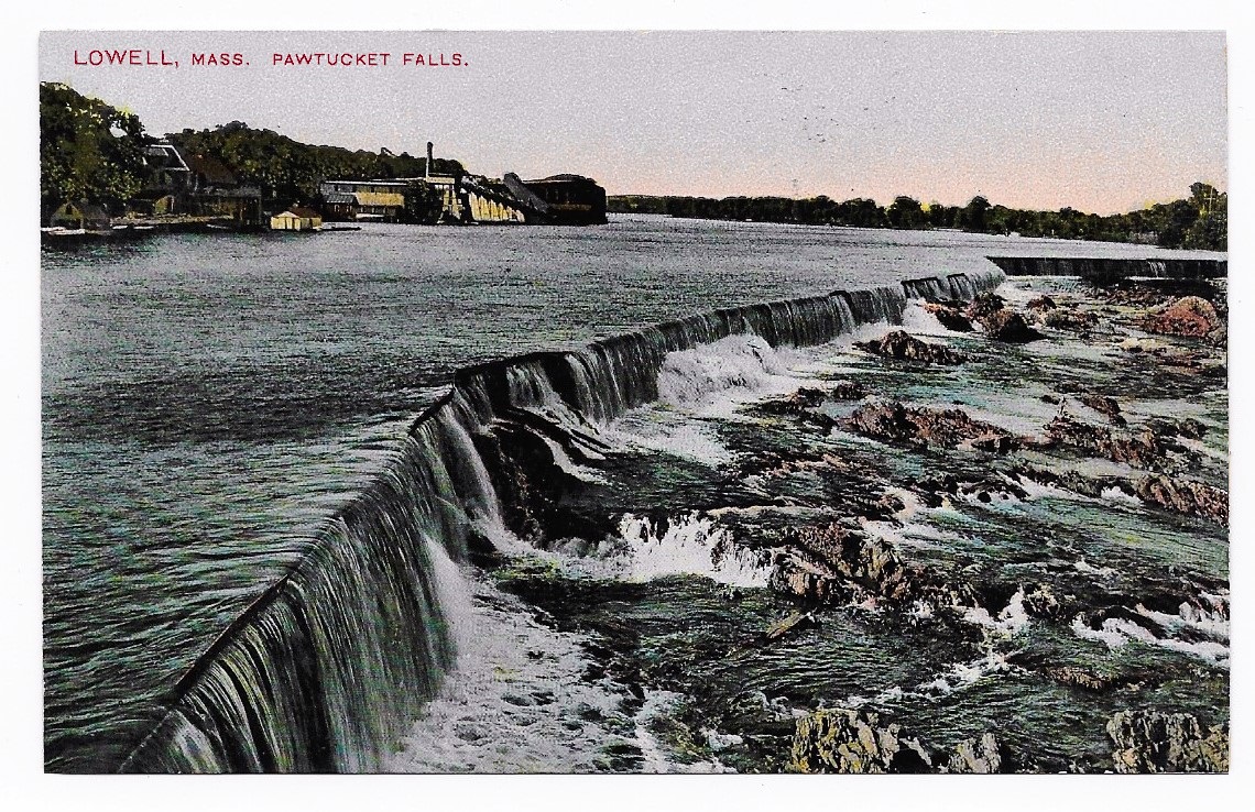 The face of the postcard is a photograph of the natural falls on the Merrimack River – labeled “Pawtucket Falls” for the indigenous people who one lived in the area.