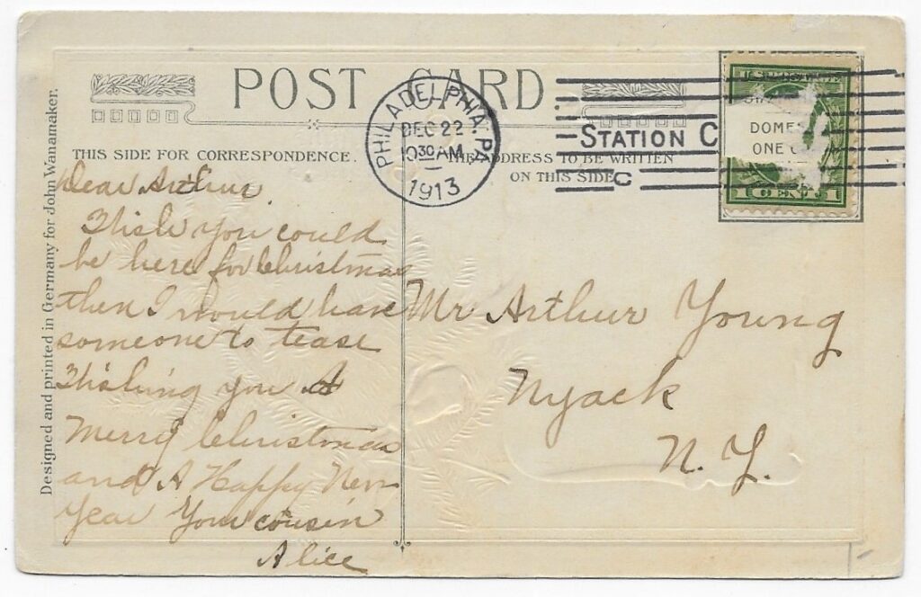 In December of 1913, Arthur received a Christmas postcard from his cousin, Alice.