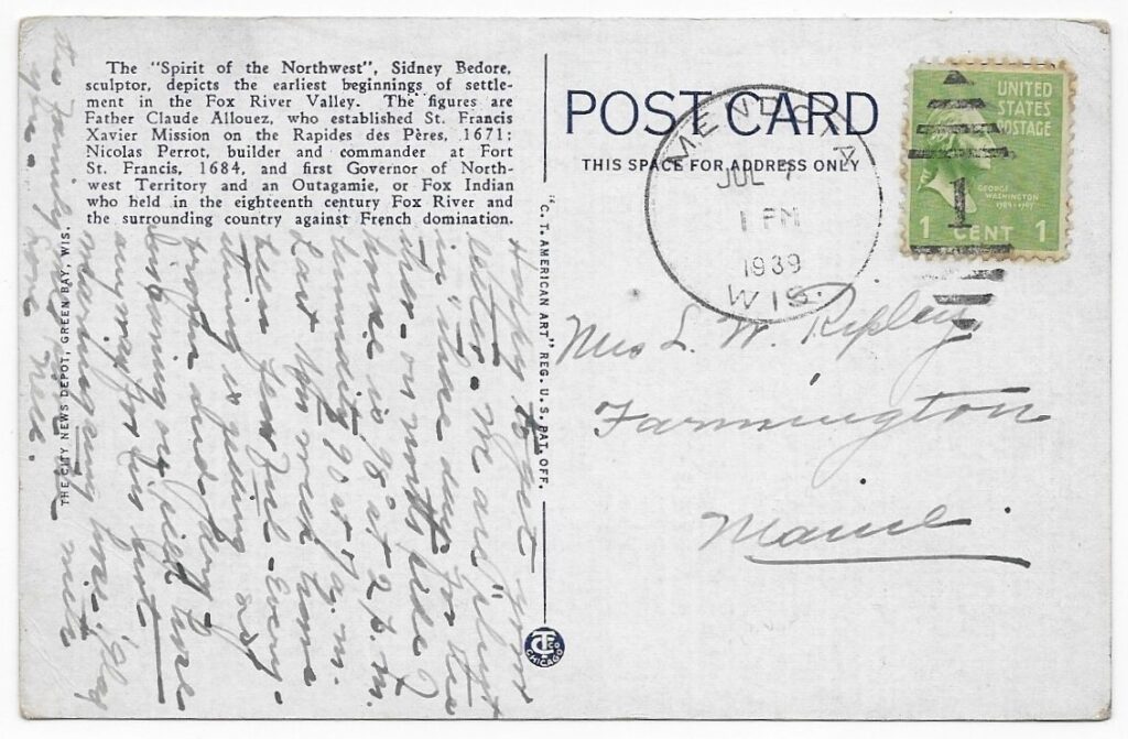 The face of the postcard is a photograph of a statue in white marble entitled, “Spirit of the Northwest”.