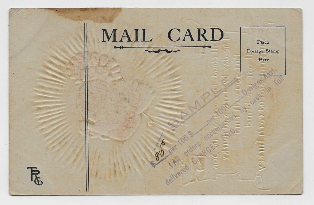 This postcard is a sample that was presented to merchants to elicit orders of Thanksgiving-themed stock.