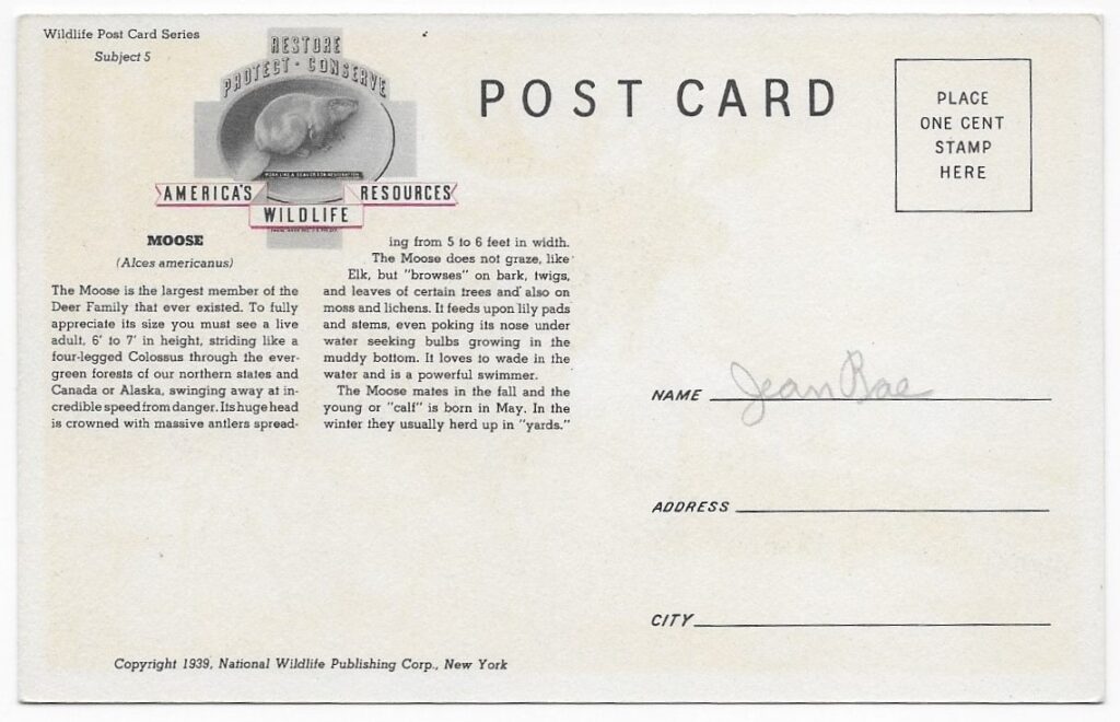 Because the same name appears on other postcards I acquired, I believe that Jean was the collector of the wildlife images.