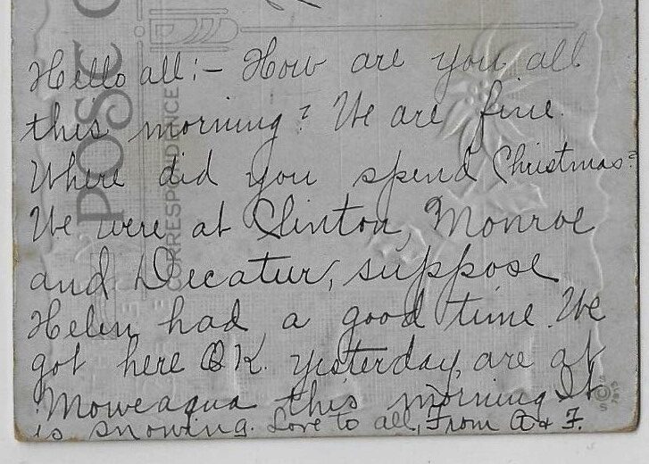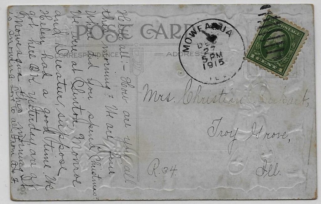 The postcard was mailed from Moweaqua, a village on the border of Shelby and Christian Counties in south-central Illinois.