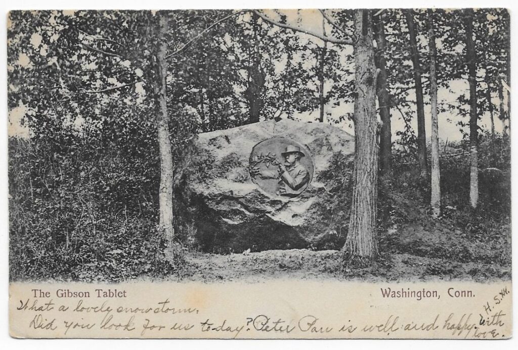 The face of the postcard is a photograph of “The Gibson Tablet”, with a printed location of Washington, CT.